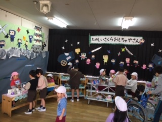 あちこちに所狭しと並べられたたくさんの作品。お店屋さん風になっていて、とても楽しそうに見て回ったり、遊んだりしていました。