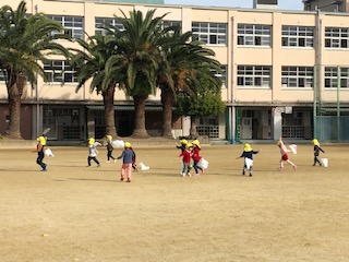 子ども展覧会でお家の人と作った凧を、小学校の校庭であげました。広い校庭、高い空になかなかうまくあがらなかったりもしましたが、元気いっぱい走って凧揚げを楽しみました。ひよこらんどのお友達も楽しかったと笑顔で話していました!