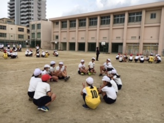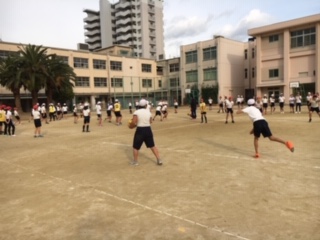 今日、午後から今里小学校、中本小学校の6年生を迎えて、三校スポーツ交流会を開催しました。中学校進学を前に、仲良くなろうという会でした。10チームに分かれて、ドッジボールと長縄跳びを楽しみました。どのチームも笑顔いっぱいに交流を楽しんでいました。