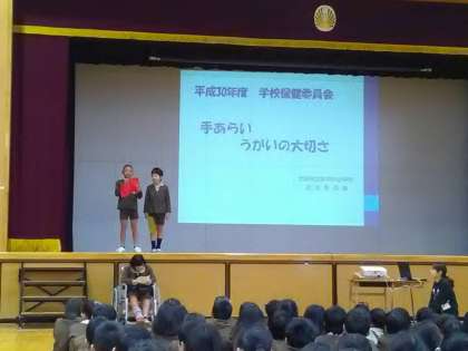 12日、健康委員会の児童による学校保健委員会の発表がありました。