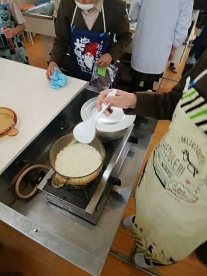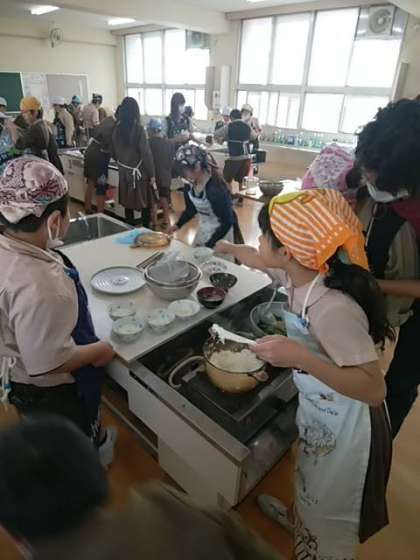 6年生に続き、5年生は今日、調理実習をしました。食べて元気に「ごはんとみそ汁」