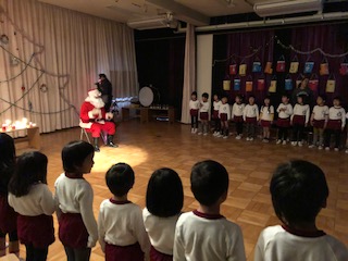 幼稚園に届いた手紙の通り、サンタクロースがやって来ました!いろいろは質問に答えてもらったり、プレゼントをもらったり、さよならする時には、ハグや握手をしてもらい大喜びの子どもたちでした。