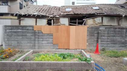 これまで、ロープで立ち入りを禁止していましたが、PTA実行委員会で、入ろうと思えば入れると心配される意見が出されました。早速、コンクリートが崩れている箇所に板を張り付け、安全面での強化を図りました。本校、管理作業員による作業です。さらに、油性塗料で補強します。
