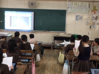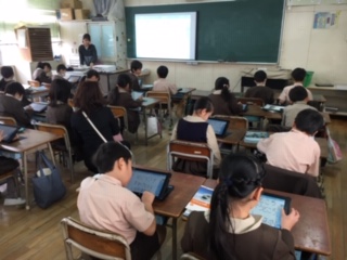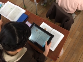 2年生の国語の授業風景の一コマです。タブレットで自分のノートを撮影し、それをみんなに見せながら調べたことを発表していました。IC環境が随分と整ってきたおかげで、一人の資料をみんなで共有することが楽にできるようになってきました。