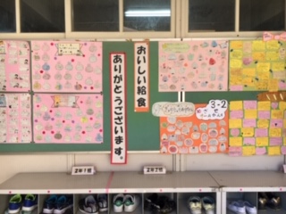 先週は給食週間でした。感謝のメッセージカードを職員室前に貼っています。また、全校でもぐもぐタイムを設定して、できるだけ残さず食べようという取組をすすめました。今日は給食調理員さんに感謝の気持ちを伝えたり、爆弾ゲームで好きなメニューを言い合ったりしました。