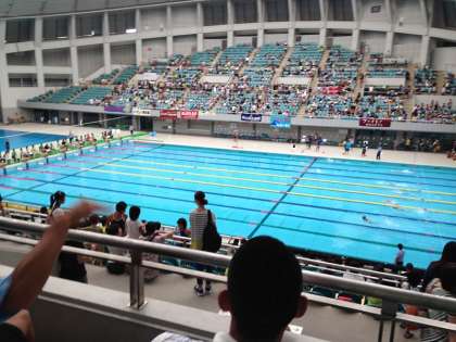 本校からは14名の児童が出場し、あの50メートルの国際公認プールで泳力を競いました。