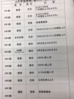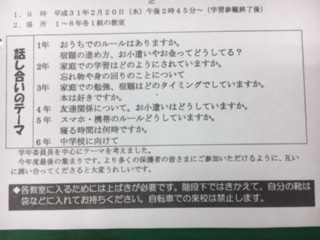 参観後は、各学年とも1組の教室でPTA学年の集いを行います。多数ご参加ください。