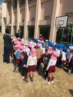 今日は、園庭で遊んでいる時に火災が起きた想定で避難訓練をしました。更に、小学校ピロティあたりまで2次避難も行いました。これまでの経験から、慌てず、無事に避難できました。