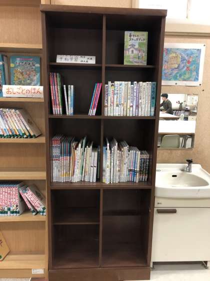 この本棚はもとは食器棚で、処分れるところだったものを管理作業員さんがリメイクしてくださいました。背の高い本も入るので、とても使いやすいです。