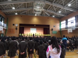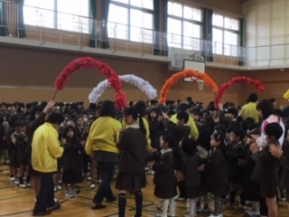 全校児童から折句でありがとうのメッセージ、ありがとうの花の歌、児童会の児童が作ったありがとうの花をプレゼントしました。