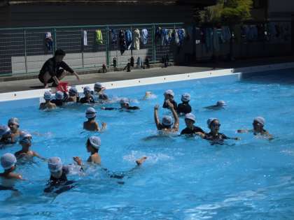 2年生のプールでは、久しぶりに宝さがしをしました。みんな大喜び。水の中にもぐって、あっという間にたくさんの宝が集まりました。