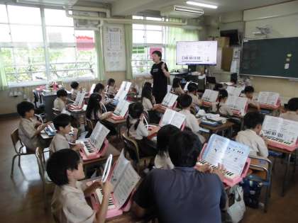 1年生では、鍵盤ハーモニカをふきました。指使いに気をつけて、ドレミファソと順にふくことができました。小指で「ソ」をふくのが難しいですが、しっかり先生の話を聞きながら上手にふいていました。