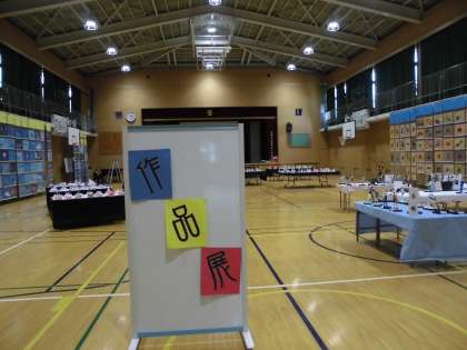 講堂は、準備万端!個性豊かな作品が並んでいます。