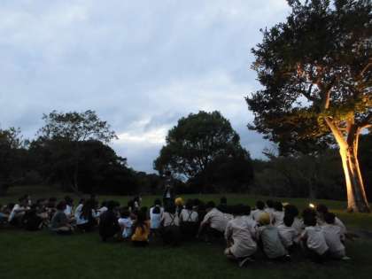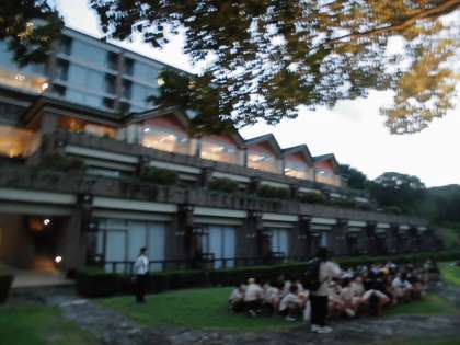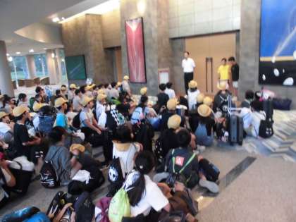 開舎式・避難訓練を行いました。とてもきれいで広いホテルに感動していました。