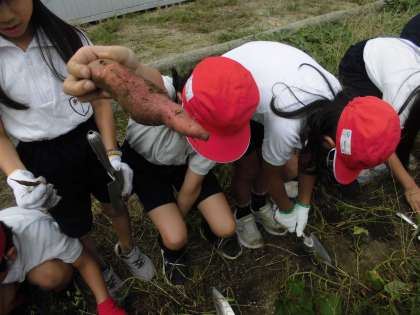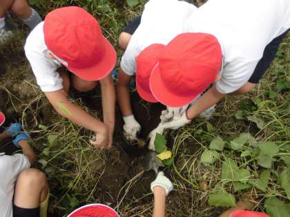 なかなかほれないおいもに、「これ、めっちゃ長い!」と興奮したり、少し、小さめのおいもには、「これは、ちょっと栄養不足やな。」と、感想を言いながら楽しく活動していました。実りの秋を体でしっかりと感じることができました。