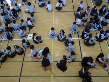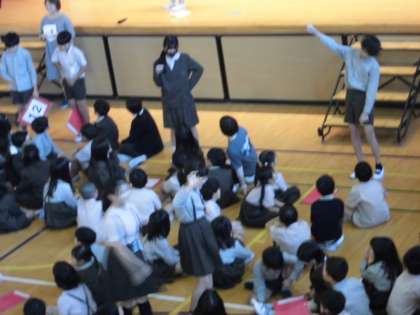 リーダーが、お題のジェスチャーを班の前ですると、「〇〇!!」と答えが飛び交いました。お題がドラえもんのときは、顔からパンをちぎったジェスチャーやいろいろな道具を四次元ポケットから出しているジェスチャーなどがあり、みんな楽しんでいました。