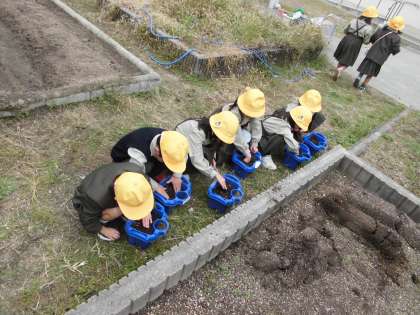 今日は、1年生がチューリップの球根を植えました。きれいな花が咲くといいなと心をこめて、ていねいに植えていました。