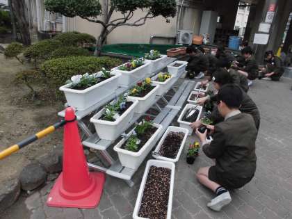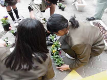 委員会の時間には、環境委員会がパンジーの花をプランターに植えました。校門にきれいに並んでいます。