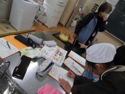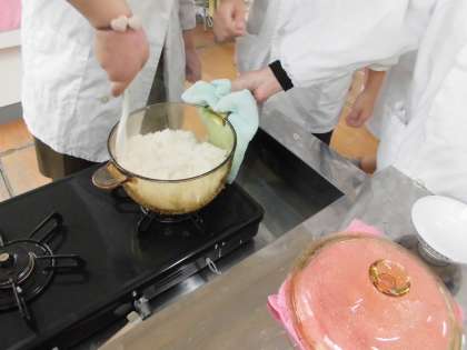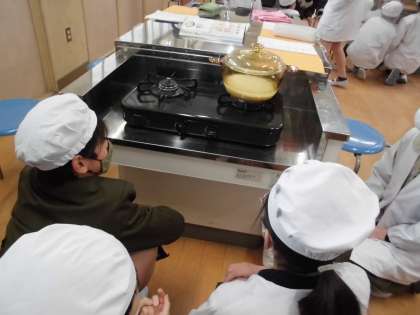 強火から弱火へ。沸騰すると水分がどんどん蒸発していきました。その勢いにみんなびっくりしながらも、出来上がるまでの様子もしっかりと観察してメモもしました。