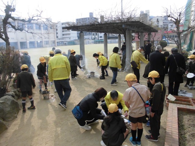 昔の道具「七輪」を使って、炭でおもちを焼きました。