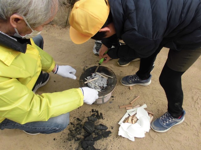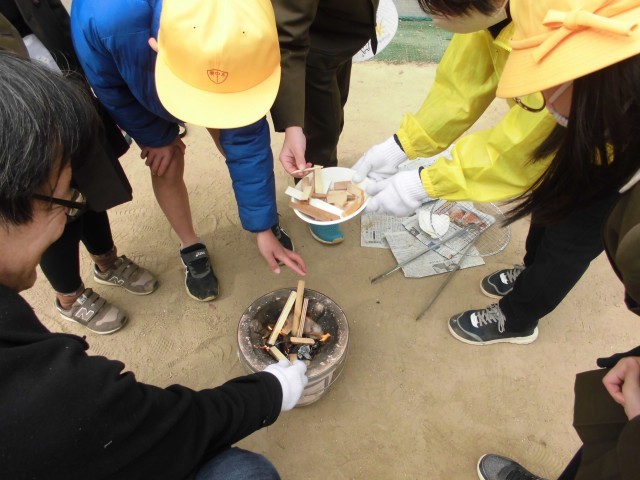 炭に火をつけるところから始めました。新聞紙をちぎって丸めて、小さな紙をおいて、さらに小さな木をのせて・・・