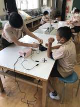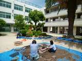 ↑明日の登校日に向けて、2年生の先生方と管理作業員さんが、植木鉢の準備をしていま...