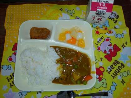 今日は入学祝い献立で、子どもたちの大好きな、カツカレーライス、フルーツ白玉が用意されました。