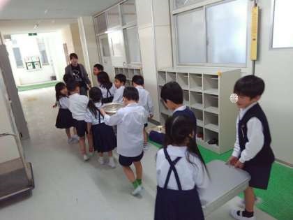 6年生が、1年生の教室に給食を運んでくれました。