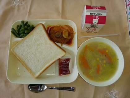 <パン 牛乳 煮こみハンバーグ コーンスープ さんどまめのサラダ