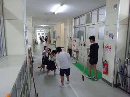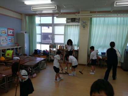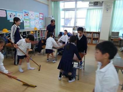 ほうきの扱い方やぞうきんを絞って机をふくことなど、6年生が教えてくれました。