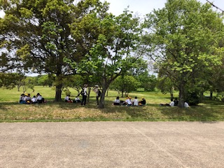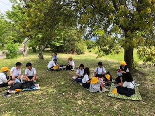 木陰にすわり、みんなで食べるお弁当、とても美味しいです。