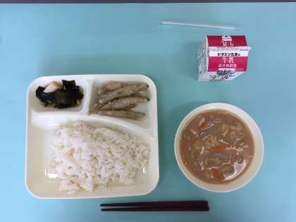 [豚汁 きびなご天ぷら わかたけ煮 ごはん 牛乳]