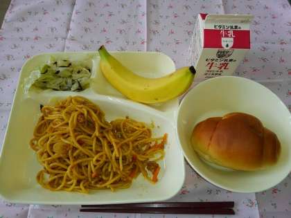 <1/2パン 牛乳 カレースパゲッティ キャベツのひじきドレッシング