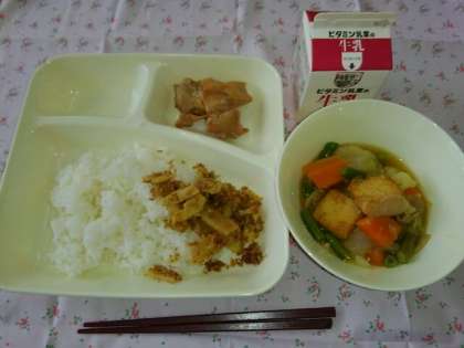 <ごはん 牛乳 鶏肉のてりやき じゃがいもとあつあげの煮もの ごまかかいため>