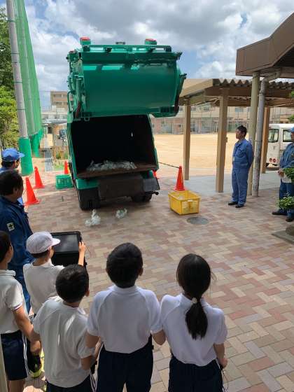 東部環境事業センターの方と地域ゴミゼロリーダーの方に来ていただき、パッカー車の体験学習を行いました。