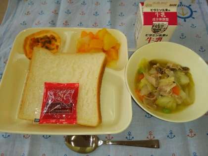 <食パン 牛乳 豚肉と野菜のスープ煮 変わりピザ ミックスフルーツ(缶) いちごジャム>