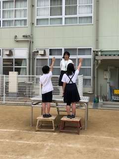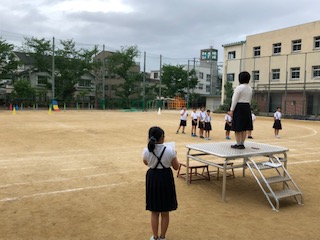 今里小のみんながスムーズに動けるように、プラカード係は並ぶ位置を確認し、入場の入り方、歩き方を練習しました。