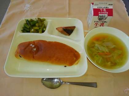 <パン 牛乳 かつおのガーリック焼き 鶏肉とじゃがいものスープ グリーンアスパラガスのサラダ>