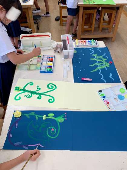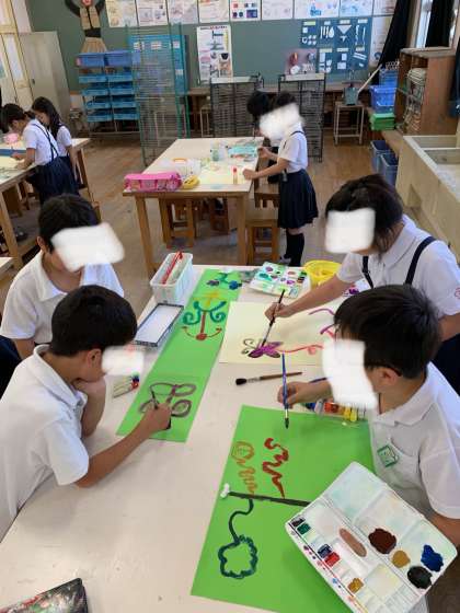 紙粘土でまぼろしの花の種を作りました。今日は、その種を蒔き、画用紙いっぱいに花を咲かせました!