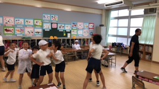 上級生が下級生と一緒に、チェッコリダンスを踊って楽しんでいます。