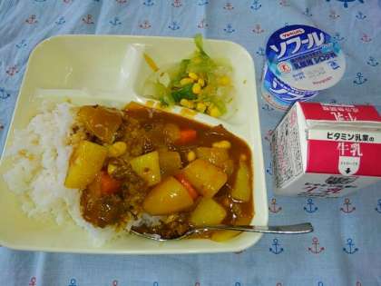 <牛乳 牛肉と大豆のカレーライス レタスとコーンのサラダ ヨーグルト>