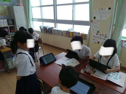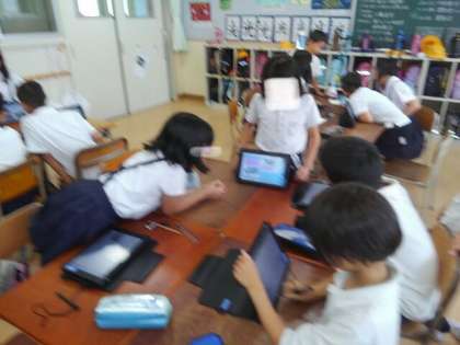 ごみ焼却工場の見学やパッカー車体験学習を終え、タブレットを使ってまとめました。