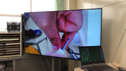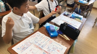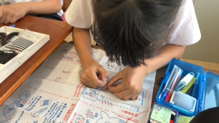 うでの長さくらいに糸を出し、糸切りバサミで切ります。