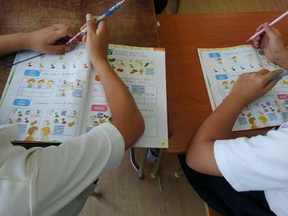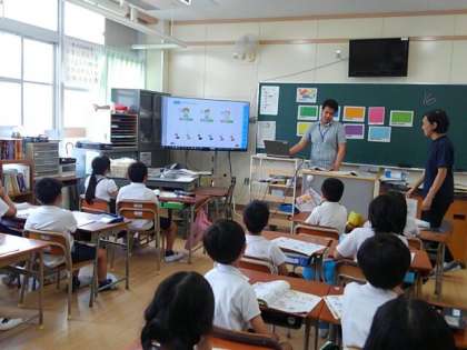 「I like〜.」の学習をしました。身の回りの色を英語で表すと何になるのか、好きな色を聞くときは何と言うのか聞きます。
