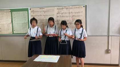 3人組でリズム打ちがうまくできたら、次は打楽器を手に取り練習です。