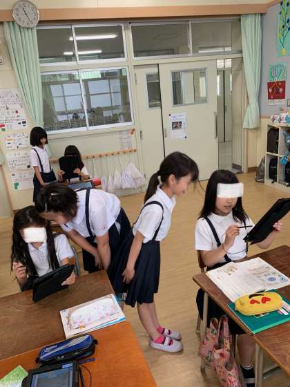 案内役の児童は、タブレットに矢印を書き込んだり、知っておいた方が良い情報を加えて話すことができていました。