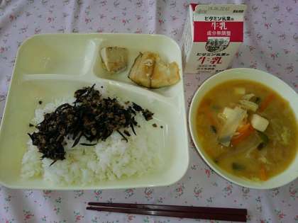 <ごはん 牛乳 さごしの塩焼き みそ汁 牛ひじきそぼろ>
