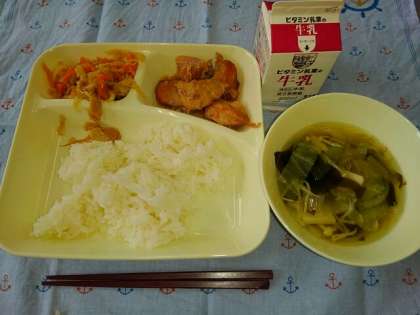 <ごはん 牛乳 鶏肉のしょうゆバター焼き 五目汁 切干しだいこんのいため煮>