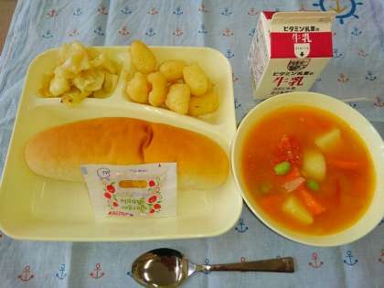 <パン 牛乳 いかてんぷら フレッシュトマトのスープ煮 サワーソテー りんごジャム>