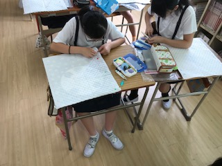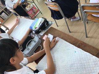 今、家庭科で林間に持っていけるようにナップザックを作っています。